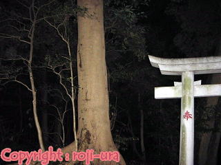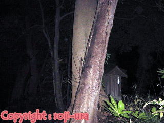 ■写真でもわかるとおり、この参道には外灯もなく、真っ暗であります。 この写真も暗闇を闇雲に撮影したのですが、気の向こうに小さな社が“たまたま”撮影され面白いので採用。(笑) |
